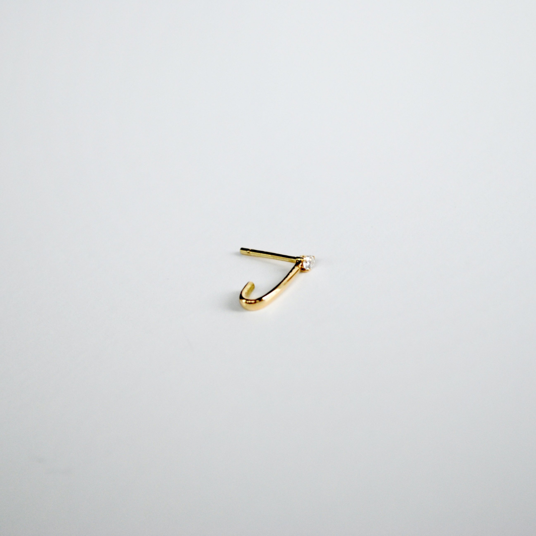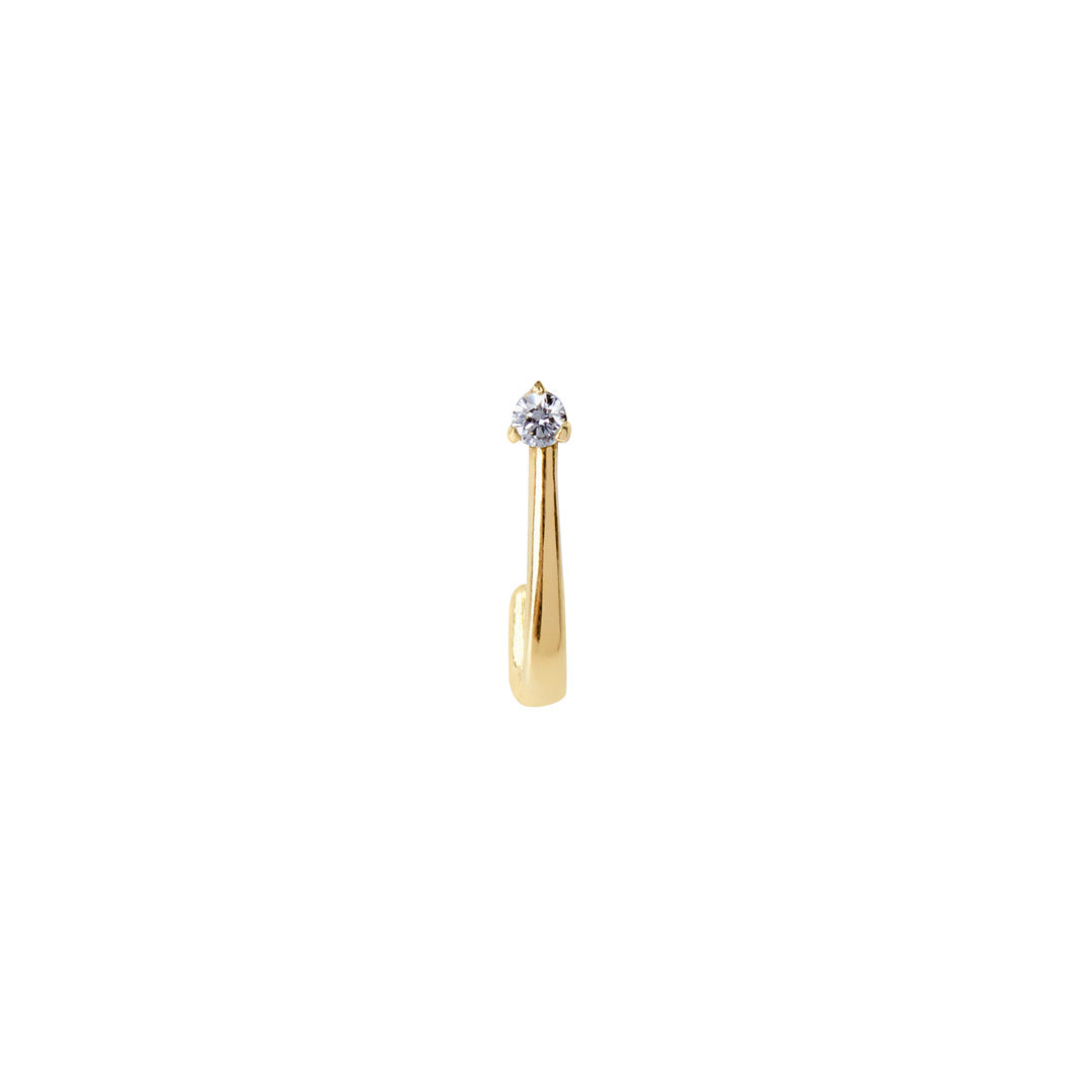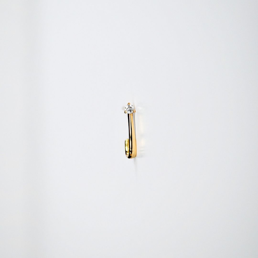 Pendiente en oro 9kt con diamante engarzado con tres garras, e hilo curvo hacia atrás.Detalles del diamante: de 1.9m/m 0,027 quilates. Color H; Pureza SI; Talla brillante.