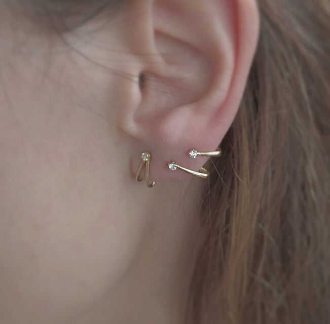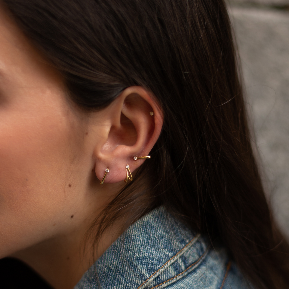 Pendiente en oro 9K con diamante engarzado con tres garras, y dos hilos curvos hacia atrás.